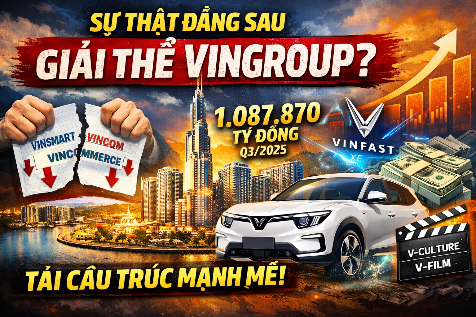 Tóm tắt các ý chính Vingroup không hề giải thể mà đang thực hiện tái cấu trúc chiến lược, thoái vốn khỏi các lĩnh vực phi cốt lõi như VinSmart, VinCommerce, Vincom Retail để tập trung vào công nghệ và bất động sản cao cấp. Tổng tài sản tăng 30%